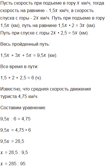 Турист шел 2 ч по равнине, 1,5 ч поднимался в гору и 2,5 ч спускался с горы. Скорость туриста на равнине в 1,5 раза больше скорости при подъеме в гору, а скорость спуска с горы в 2 раза больше скорости при подъеме в гору. Найдите скорость туриста при подъеме в гору, если его средняя скорость на всем пути 4,75 км/ч.