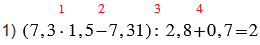 1) (7,3 • 1,5 - 7,31) : 2,8 + 0,7;