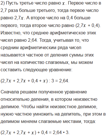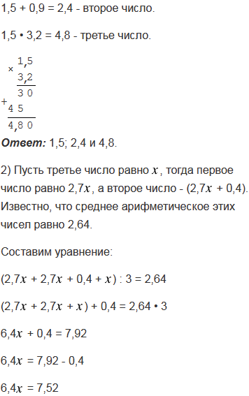 2) Среднее арифметическое трех чисел равно 2,64. Найдите эти числа, если первое число в 2,7 раза больше третьего, а второе на 0,4 больше первого.