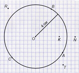 в) Отметьте точку N на расстоянии 5 см от центра окружности и точку K на расстоянии 3 см от центра окружности. Какая из отмеченных точек лежит вне круга, а какая - внутри круга, ограниченного окружностью?