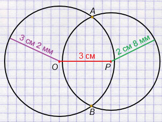 3. Изобразите точки О и Р, расстояние между которыми 3 см. Проведите окружность с центром в точке О и радиусом 3 см 2 мм и окружность с центром в точке Р и радиусом 2 см 8 мм. Сколько точек пересечения имеют построенные окружности?