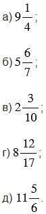 Чтобы преобразовать смешанное число в неправильную дробь, надо целую часть числа умножить на знаменатель дробной части и к полученному произведению прибавить числитель дробной части; эту сумму записать как числитель неправильной дроби, а в ее знаменатель записать знаменатель дробной части смешанного числа.
