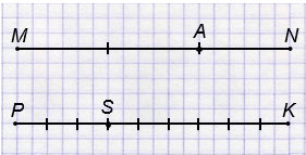 Проведите равные отрезки МN и РK длиной 9 см. Отметьте отрезка МN от точки М и поставьте точку А. Отметьте отрезка РK от точки K и поставьте точку S. Сравните с помощью циркуля отрезки МА и KS. Сделайте вывод.