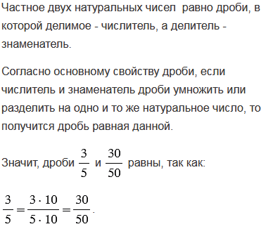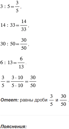 Запишите в виде обыкновенных дробей частные 3 : 5, 14 : 33, 30 : 50 и 6 : 13. Какие из полученных дробей равны?