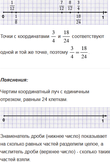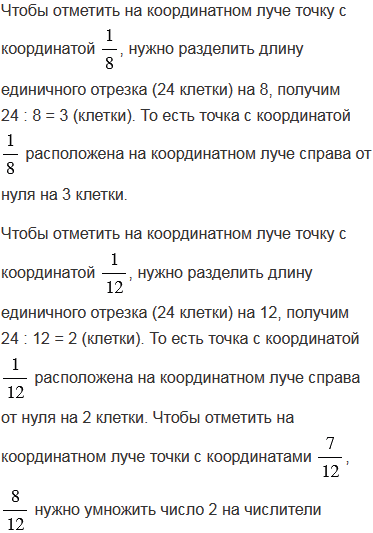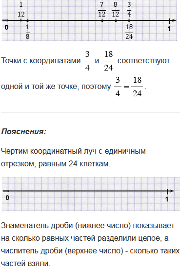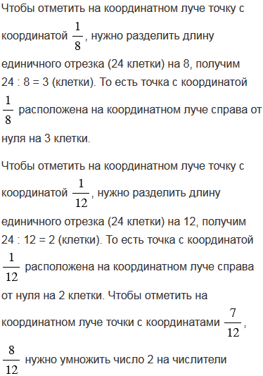 Приняв за единичный отрезок 24 клетки тетради, начертите координатный луч. Отметьте на этом луче точки с координатами . Какие из координат соответствуют одной и той же точке? Запишите равенства.