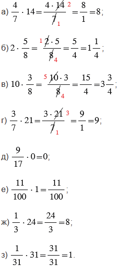 Чтобы вычисления были проще, не надо перемножать сразу числители и знаменатели, лучше сделать это после сокращения их на общие множители. Если при вычислениях получилась неправильная дробь, ее преобразуют в смешанное число (выделяют целую часть) или натуральное число (когда числитель делится на знаменатель нацело).