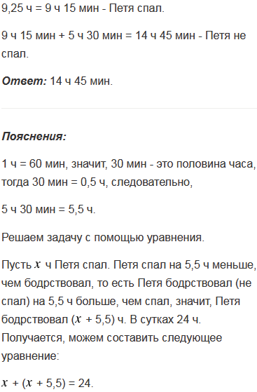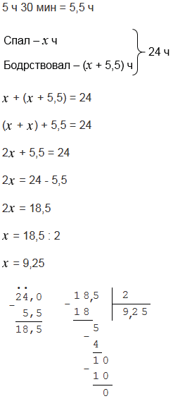 В одни из суток Петя спал на 5 ч 30 мин меньше, чем бодрствовал. Сколько времени Петя не спал?