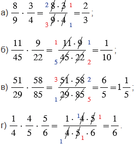 Чтобы вычисления были проще, не надо перемножать сразу числители и знаменатели, лучше сделать это после сокращения их на общие множители. Если при вычислениях получилась неправильная дробь, ее преобразуют в смешанное число (выделяют целую часть).