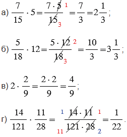 Чтобы вычисления были проще, не надо перемножать сразу числители и знаменатели, лучше сделать это после сокращения их на общие множители. Если при вычислениях получилась неправильная дробь, ее преобразуют в смешанное число (выделяют целую часть) или натуральное число (когда числитель делится на знаменатель нацело).