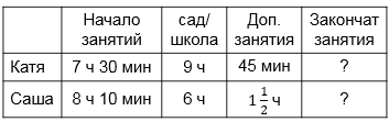 Катю отводят в детский сад к 7 ч 30 мин, там она проводит 9 часов, а потом посещает дополнительные занятия по подготовке к школе, которые длятся 45 мин. Саша идет в школу к 8 ч 10 мин, там он проводит 6 часов и идет в спортивную секцию на