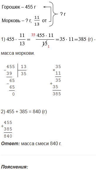 массы горошка. Найдите массу смеси, если горошка в ней 455 г.