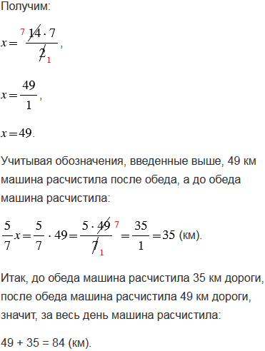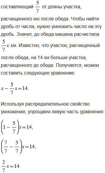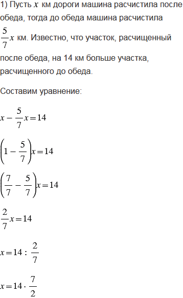 от длины участка, расчищенного ею после обеда. Сколько километров дороги она расчистила за весь день, если участок, расчищенный после обеда, оказался на 14 км больше участка, расчищенного до обеда?