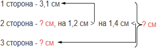 1) 3,1 + 1,2 = 4,3 (см) - длина второй стороны.