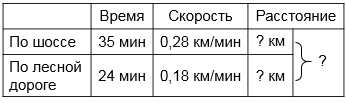 Велосипедист ехал 35 мин по шоссе со скоростью 0,28 км/мин, значит, по шоссе велосипедист проехал: