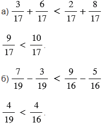 б) Чтобы сравнить выражения находим их значения, выполнив вычитание. Чтобы найти разность двух дробей с одинаковыми знаменателями, нужно из числителя уменьшаемого вычесть числитель вычитаемого, а знаменатель оставить прежним.