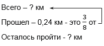 Пешеход прошел 0.24 км, что составило расстояния от остановки до дома . Дробь показывает, что всю длину газопровода разделили на 8 равных частей и взяли 3 таких части. То есть 0,24 км - это 3 части, чтобы найти одну часть, надо 0,24 км разделить на 3. А поскольку таких частей 8, то полученное значение надо умножить на 8, то есть расстояние от остановки до дома:
