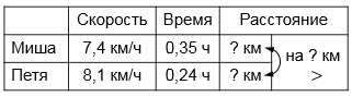 3. На тренировке Миша бежал со скоростью 7,4 км/ч в течение 0,35 ч, а Петя - со скоростью 8,1 км/ч в течение 0,24 ч. Кто из мальчиков пробежал большую дистанцию и на сколько?