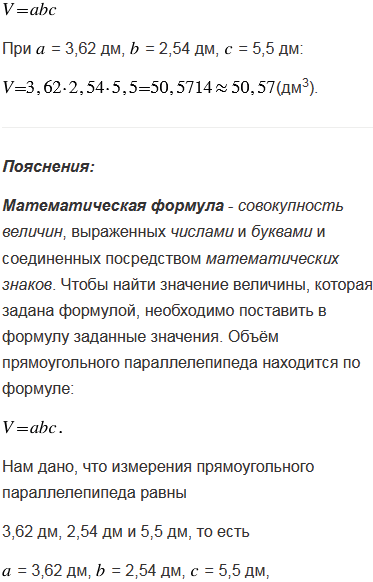 Вычислите на калькуляторе объём прямоугольного параллелепипеда, если его измерения равны 3,62 дм, 2,54 дм и 5,5 дм. Ответ округлите до сотых.