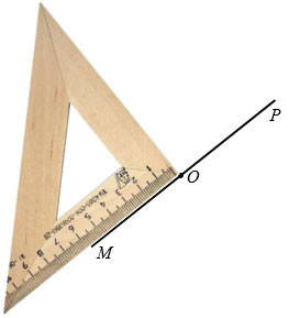 Затем вершину прямого угла чертежного треугольника совмещаем с точкой О, а одну из сторон с лучом ОМ.