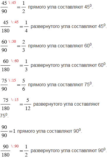 Найдите, какую часть прямого и какую часть развернутого углов составляют углы, равные 10, 100, 200, 300, 450, 600, 750, 900.
