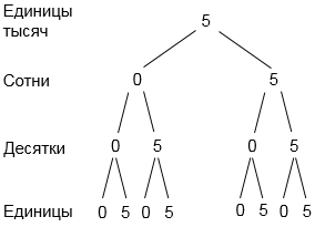 Чтобы определить все четырехзначные числа, в записи которых используют цифры 5 и 0, построим схему, которая называется деревом возможных вариантов.