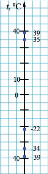 Начертите шкалу температур от -400C до 400C, приняв отрезок длинной 1 см за 100C. Отметьте на этой шкале: