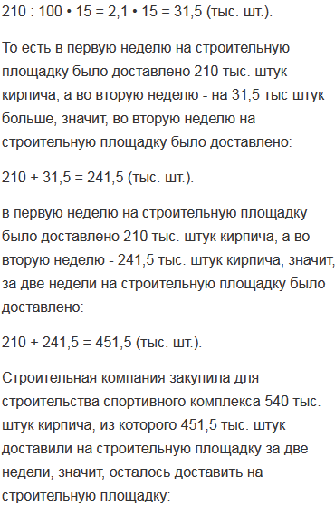 закупленного кирпича, во вторую неделю - на 15% больше, чем в первую. Какое количество кирпича осталось доставить на строительную площадку?