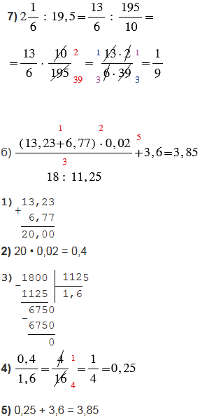 Обратите внимание, красные числа, стоящие сверху над действиями, указывают порядок действий, только в пункте а) не указано седьмое действие - это черта дроби (действие деления числителя на знаменатель), а в пункте б) не указано четвертое действие - это также черта дроби.