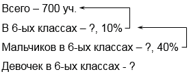 а) В школе 700 учащихся. В шестых классах учатся 10% всех школьников, причем 40% из них мальчики. Найдите, сколько мальчиков и девочек учится в шестых классах?
