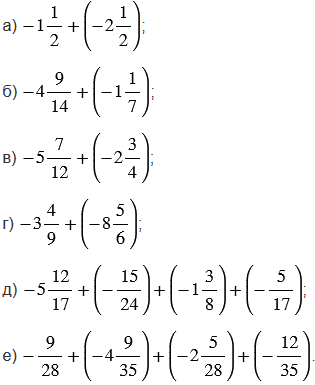 В пунктах д) и е), чтобы упростить вычисления, используем переместительное и сочетательное свойства сложения (группируем слагаемые с одинаковыми знаменателями или с такими знаменателями, которые проще привести к общему знаменателю).