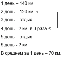 а) Путешествие на теплоходе длилось 6 дней. В первый и второй дни путешественники проплыли соответственно 140 км и 120 км, в четвертый день они проплыли в 3 раза меньше, чем во второй, а в третий и пятый дни они отдыхали. Сколько километров они проплыли в шестой день, если за 6 дней они проплывали в среднем по 70 км в день?