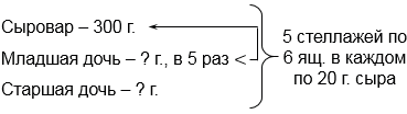 б) Сыровар и две его дочери разместили изготовленные сыры на 5 стеллажах. На каждый стеллаж поставили по 6 ящиков, вмещающих по 20 головок сыра. Сыровар изготовил 300 головок сыра, а младшая дочь - в 5 раз меньше. Сколько головок сыра изготовила старшая дочь?