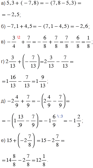 Чтобы сложить два числа с разными знаками, надо: найти модули слагаемых (модуль числа принимает только неотрицательные значения); из большего модуля вычесть меньший модуль; перед полученным числом поставить знак слагаемого с большим модулем (обычно сначала определяют и записывают знак суммы, а потом в скобках находят разность модулей, если сумма в итоге получается положительной, то скобки можно не ставить).
