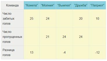 В таблице представлены некоторые результаты матчей школьных команд по футболу. У какой команды лучшая разница голов (разность числа забитых голов и числа пропущенных голов). У каких команд она одинаковая?