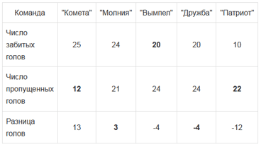 Ответ: лучшая разница голов у команды "Комета"; разница голов одинаковая у команд "Вымпел" и "Дружба".