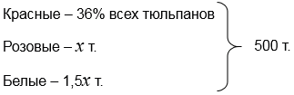 На клумбу высажено 500 тюльпанов. Тюльпаны красного цвета составляют 36% всех цветов. Остальные тюльпаны белые и розовые. Белых тюльпанов в 1,5 раз больше, чем розовых. Сколько тюльпанов каждого цвета на клумбе?