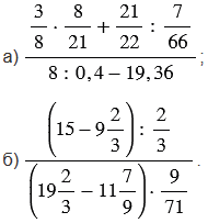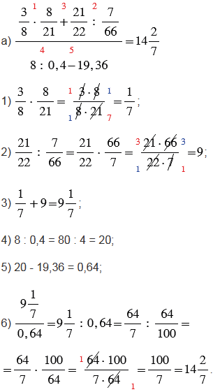 Обратите внимание, красные числа, стоящие сверху над действиями, указывают порядок действий, только в пункте а) не указано шестое действие - это черта дроби (действие деления числителя на знаменатель), в пункте б) не указано пятое действие - это черта дроби.