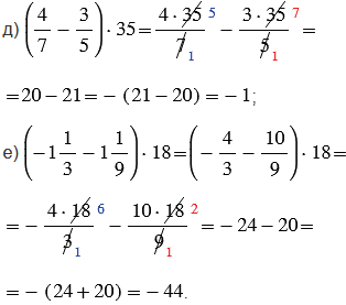 При выполнении вычислений используем распределительное свойство умножения, т.е. в пунктах а), б), и г) выносим одинаковые множители за скобки, затем выполняем вычисления в скобках и умножаем полученный результат на вынесенный множитель, а в пунктах д) и е), наоборот, раскрываем скобки умножая каждый из компонентов, стоящих в скобках, на множитель, стоящий за скобками, затем складываем (вычитаем) полученные произведения. В пункте в) никакие свойства применить нельзя, поэтому вычисления выполняем соблюдая следующий порядок: умножение, деление, сложение.