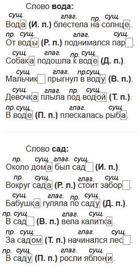 Придумайте и запишите шесть предложений с одним из данных слов так, чтобы выбранное вами слово употреблялось во всех шести падежах по порядку. В записанных предложениях укажите, к какой части речи относится каждое слово. Выделите окончания.
