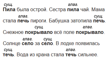 Пила была острой. Сестра пила чай. Мама стала печь пироги. Бабушка затопила печь. Снежное покрывало всё поле покрывало. Солнце село за село. В лодке появилась течь. Вода из крана стала течь сильнее.