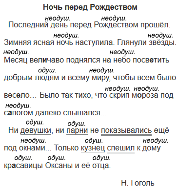 Последний день перед Рождеством прошёл. Зимняя ясная ночь наступила. Глянули звёзды. Месяц вел..чаво поднялся на небо посв..тить добрым людям и всему миру, чтобы всем было вес..ло… Было так тихо, что скрип м..роза под с..погом далеко слышался...