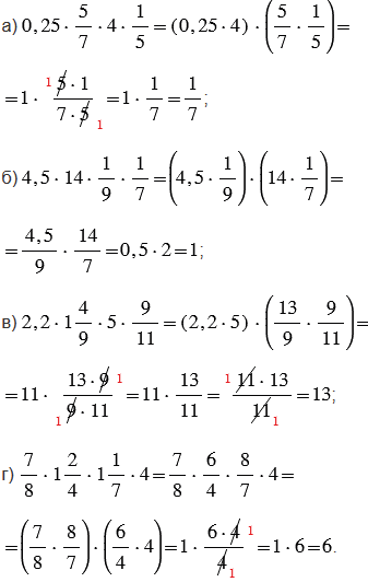 При вычислениях используем переместительное и сочетательное свойства умножения, то есть группируем множители так, чтобы вычисления были проще.