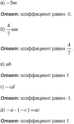 Числовой множитель в выражении, которое является произведением числа и одной или нескольких букв, называют числовым коэффициентом (или просто коэффициентом).
