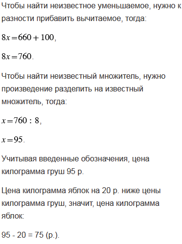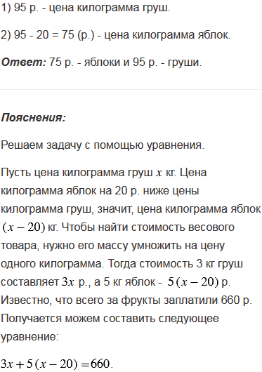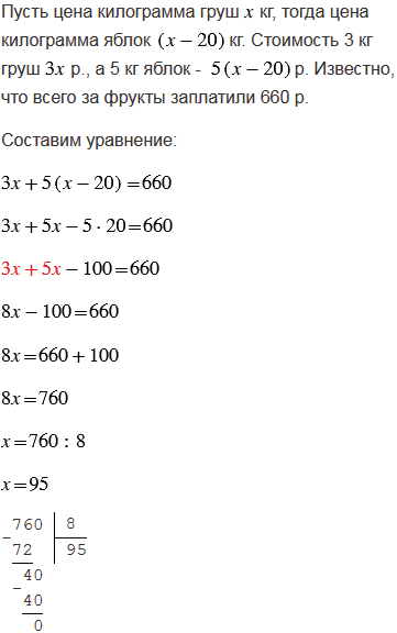 Цена килограмма яблок на 20 р. ниже цены килограмма груш. Для приготовления компота купили 3 кг груш и 5 кг яблок. По какой цене покупали фрукты, если за покупку заплатили 660 р.?