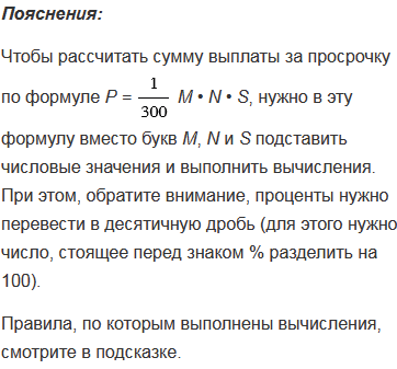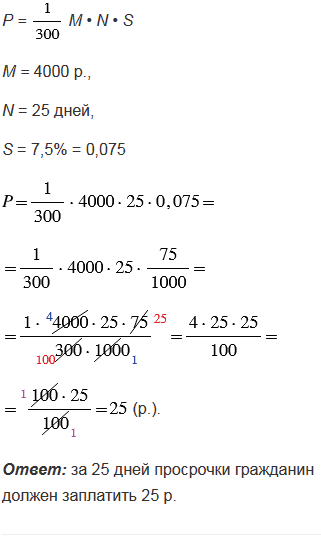 М • N • S, где М - сумма долга в рублях, N - количество дней просрочки, S - ставка рефинансирования Центрального банка в процентах. Рассчитайте пени за 25 дней просрочки, которую должен заплатить гражданин при сумме долга 4000 р. и ставке рефинансирования 7,5%.