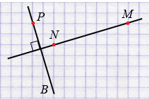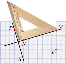 б) Чтобы через точку Р провести прямую, перпендикулярную прямой NМ, сначала продолжаем прямую NM влево, затем прикладываем чертежный треугольник так, чтобы прямая NM лежала вдоль одной из сторон треугольника, образующей прямой угол, а вдоль другой стороны треугольника, образующей прямой угол, лежала точка Р и проводим через точку Р вдоль стороны угольника прямую, которая и будет перпендикулярна прямой NM, то есть прямая РВ