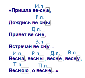 Выражение склоняется «весна» означает изменение по падежам. При склонении изменяется окончание.