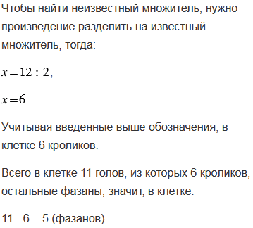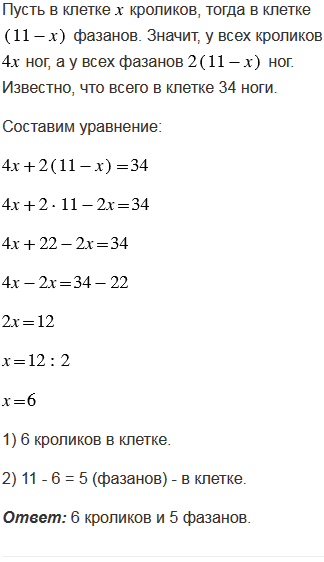 Старинная задача. В клетке сидят фазаны и кролики. У них 11 голов и 34 ноги. Сколько кроликов и сколько фазанов в клетке?