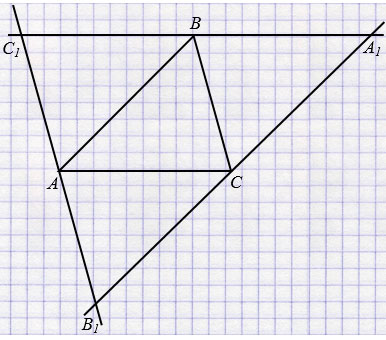 Нарисуйте треугольник АВС и проведите через его вершины А, В и С прямые, параллельные противоположным сторонам. Обозначьте вершины получившегося треугольника А1, В1 и С1 так, чтобы точки А и А1 лежали по разные стороны от прямой ВС, а точки В и В1 - от прямой АС. Сравните длины сторон АВ и А1В1, АС и А1С1, ВС и В1С1. Сделайте предположение.