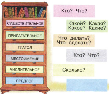 Рассмотрите рисунок. Прочитайте названия частей речи и вопросы к ним. Все ли части речи вам знакомы? Ко всем ли частям речи можно поставить вопросы? Объясните свой ответ.